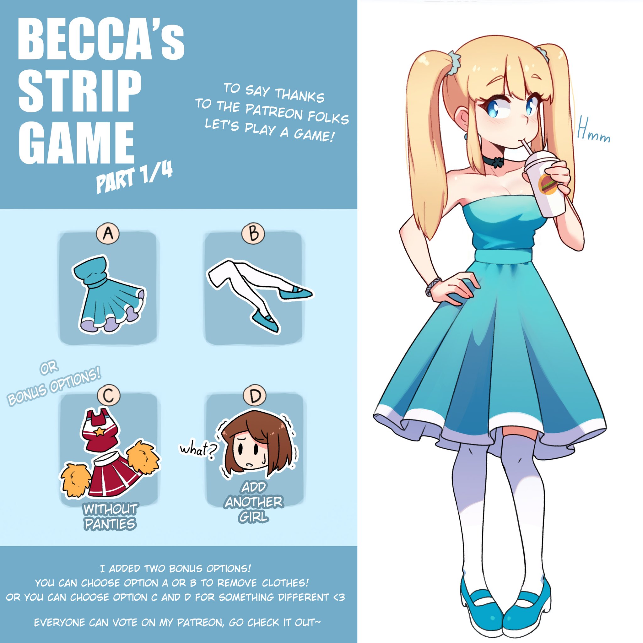 To say thanks to my supporters on Patreon, here's an exclusive Strip Game ~ Becca is my new OC and this strip game will be her debut ❤️ (Part 1/4) https://t.co/vEQVpLVPia